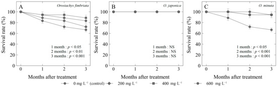 With regards to the ground cover, the application of 600 mg·L−1 resulted in the greatest ground cover in O. fimbrata (38.0 cm2) and O. minuta (27.7 cm2). However, in O. japonica, the ground cover showed no significant differences by treatment.