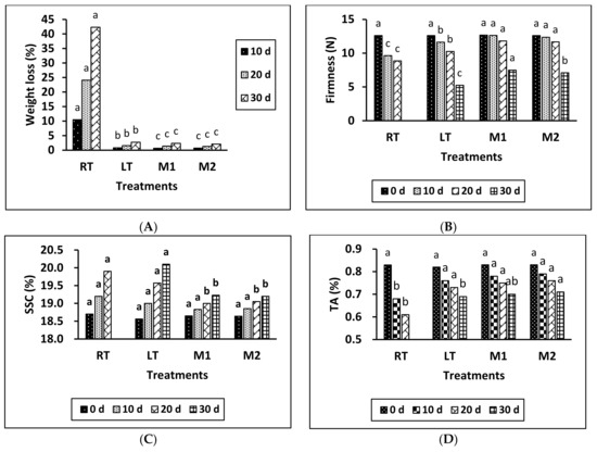 Furthermore, the TA percentage in all samples gradually decreased during storage. There were no significant differences between M1, M2, and LT treatments at 0, 10, and 20 days of storage, except for the 30-day storage interval, where a significant difference was observed between the M2 and LT treatments. The RT treatment exhibited a much lower TA percentage compared to the other treatments. Therefore, the main result is that the MeJA treatment greatly slowed the rise in SSC, especially after 30 days of storage. It also had different effects on TA compared to the other treatments.