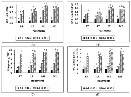 According to the data shown in Figure 2A–C, the levels of SOD, CAT, and APX activity initially increased in all treatment groups and gradually declined toward the end of the storage period. The highest activity was observed on day 20 in the M1, M2, LT, and RT treatments. The application of MeJA resulted in higher values of SOD, CAT, and APX compared to all other treatments. Additionally, a significant difference was observed between LT and RT, with RT exhibiting the lowest values of SOD, CAT, and APX compared to the other treatments. Moreover, a significant difference in the content of SOD, CAT, and PPO was found between M1 and M2 at 20 and 30 days of storage. However, there was no clear effect observed in APX between the M1 and M2 treatments during all storage periods.