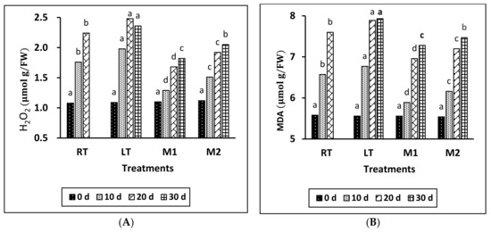 3.3. Effect of RT, LT, and MeJA on H2O2 and MDA Content