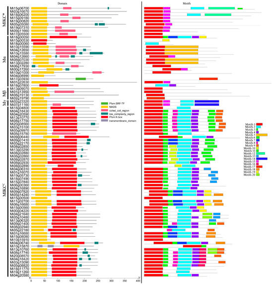 The motif distribution of MiMADS proteins was analyzed using the MEME online software tool. A total of 20 conserved motifs, designated as motifs 1–20, were identified in the set of 84 MiMADS proteins (Figure 1). The detected motifs were annotated using NCBI CD search. As anticipated, motif 1 corresponded to the typical MADS-domain and was found in the majority of MiMADS proteins. Motif 2, which specifies the K domain, was prevalent among MIKCC type proteins, which were the second most conserved domain and essential for protein–protein interactions among MADS-box transcriptional factors [60]. Additionally, it was observed that most MiMADS proteins within a particular group shared a similar motif composition. For instance, motifs 5 were exclusively present in group Mα; motif 14 was solely found in groups Mγ; motifs 12 were only detected in group MIKC*; whereas motifs 6, 8, 9, 11, 13, 16, 18, and 20 occurred exclusively within group MIKCC. This suggests functional similarity within each respective group.