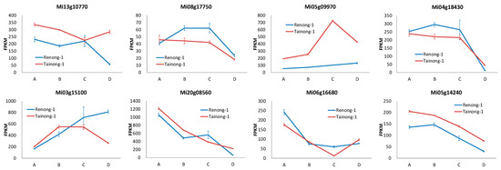 The comprehensive analysis of the phylogenetic tree and the average FPKM value (average FPKM value > 10) suggested that Mi20g08560, Mi03g15100, Mi05g09970, Mi13g10770, Mi04g18430, and Mi08g17750 from the SEP1 subfamily, as well as Mi05g14240 and Mi06g16680 from the AG subfamily, were key MiMADS genes associated with mango ripening. These results were closely aligned with the report that the AG and SEP subfamilies were the key regulators of fruit development and ripening [64]. Among them, two genes (Mi03g15100 and Mi13g10770) exhibited contrasting expression patterns during the postharvest period between Renong-1 and Tainong-1 varieties (Figure 6). Specifically, the expression levels of Mi03g15100 increased while those of Mi13g10770 decreased during the postharvest period of the Renong-1 variety. In contrast, they showed a decreasing trend for Mi03g15100 but an increasing trend for Mi13g10770 during the postharvest period of the Tainong-1 variety. The expression patterns of Mi05g09970 and Mi06g16680 in the variety Tainong-1 also exhibited contrasting trends, with an initial increase followed by a decrease, and a decrease followed by an increase during fruit development and postharvest, respectively. However, the expression levels of these two genes remained relatively stable throughout the latter three periods of Renong-1. The expression levels of Mi20g08560 and Mi05g14240 exhibited a declining trend throughout the development and postharvest in both varieties, and they were higher in Tainong-1 than in Renong-1 at most stages. The expression levels of Mi08g17750 and Mi04g18430 in Renong-1 were consistently higher than those in Tainong-1 across most stages, with a significant decrease observed during the postharvest stage, indicating that Mi08g17750 and Mi04g18430 might be involved in the inhibition of mango fruit maturation.
