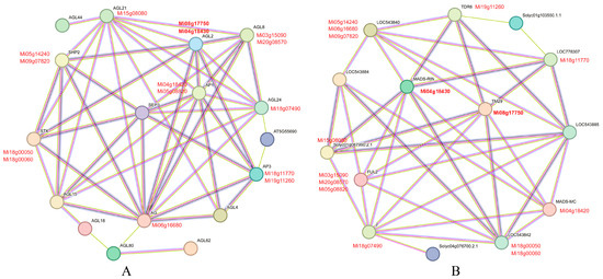 Protein–protein interactions are crucial for the functioning of MADS-box proteins; therefore, evaluating the interaction networks is valuable for characterizing gene function mechanisms. In this study, Mi08g17750 and Mi04g18430 were selected to evaluate possible protein interactions using the STRING website to construct the protein interaction networks. Arabidopsis thaliana and Solanum lycopersicum were chosen as reference organisms, respectively (Figure 7). When Arabidopsis thaliana was used as a reference, both Mi04g18430 and Mi08g17750 were shown to be highly homologous with AGL2, and they may interact with several other MiMADS proteins, including Mi03g15090, Mi20g08570, Mi18g07490, Mi18g11770, Mi19g11260, Mi06g16680, Mi04g18420, Mi05g08820, Mi05g14240, Mi09g07820, Mi18g00050, Mi18g00060, and Mi15g08080. When Solanum lycopersicum was taken as a reference, Mi04g18430 and Mi08g17750 were highly homologous with MADS-RIN and TM29, respectively. Both genes may interact with Mi19g11260, Mi18g11770, Mi04g18420, Mi18g00050, Mi18g00060, Mi18g07490, Mi03g15090, Mi20g08570, Mi05g08820, Mi06g16680, Mi05g14240, Mi09g07820, and Mi15g08080. It is worth noting that the screened proteins interacting with Mi04g18430 and Mi08g17750 are consistent when Arabidopsis thaliana and Solanum lycopersicum were taken as references, respectively.