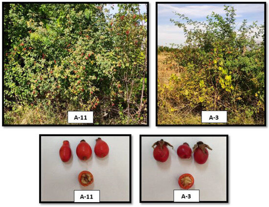 Rosehip ecotypes were named from A-1 to A-15, pre-selected according to high yield, health plant growth, and attractive fruit characteristics. The harvest date of the fruit samples is September 2022. The exocarp color of the rosehip fruits was red and different shades of red, the fruit stalk color started to turn from green to brown and the fruits started to be harvested by the people of the region where the study was carried out were effective in determining the harvest time. The tree and fruit forms of the A-3 and A-11 ecotypes are presented in Figure 2