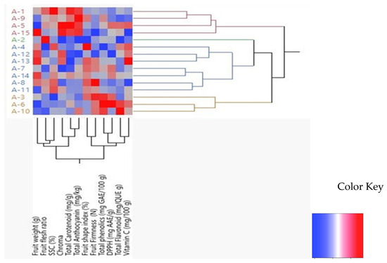 A heatmap analysis was performed to reveal the effects of R. canina ecotypes on some quality criteria and biochemical properties. In the heatmap analysis, the color change towards red on the color scale shows that the level of statistical significance has increased. In a hierarchical cluster analysis, the ecotypes were divided into four different clusters. According to the heat mapping analysis method, the A-1, A-9, A-5 and A-15 ecotypes formed a separate cluster with high fruit weight, chroma, SSC (%), total carotenoid, total anthocyanin and fruit shape index. The A-2 genotype was less significant (blue color) with all other quality criteria and biochemical contents except the fruit flesh ratio. The vitamin C content was significant in the A-13 genotype (red color). The A-3, A-6 and A-10 ecotypes formed a separate cluster with high fruit firmness, total phenolics, DPPH and total flavonoid content (Figure 3). Red indicates an increase and blue a decrease in the variables in color key.