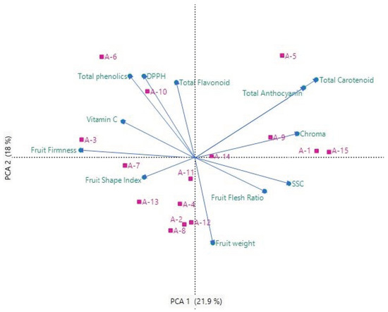 The distributions of correlation between fruit quality criteria and biochemical contents of R. canina ecotypes in the basic coordinate plane defined by PCA are given in Figure 4. As a result of the PCA analysis, it was seen that the total variation consisted of the first two basic components. As a result of the PCA analysis, it was seen that the total variation consisted of the first two main component axes, and the variation between fruit quality criteria and biochemical contents and ecotypes was 39.9%. The first principal component axis constitutes 21.9% of the total variation, and the second principal component axis constitutes 18.0% of the total variation. Therefore, it has been seen that these axes are important in the evaluation of the analysis. It was observed that the total carotenoid, total anthocyanin and chroma values of the parameters defined by PCA were parallel to each other. Similarly, the fruit weight, fruit flesh ratio and SSC (%) values were found to be parallel to each other. However, its values were negatively correlated with the vitamin C values (Figure 4).