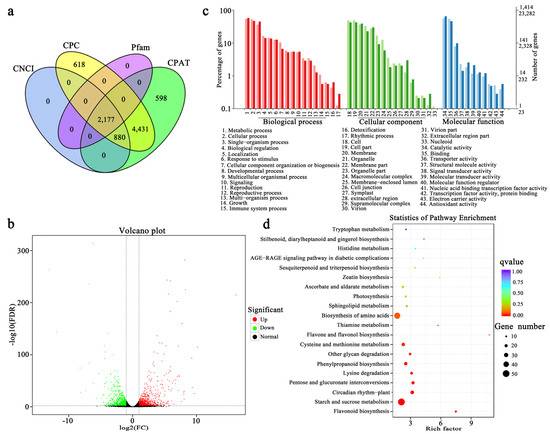 Transcriptome analysis of P. lactiflora ‘Coral Sunset’ petals. (a) Venn diagram of the number of predicted long non-coding RNAs according to CNCI, CPC, Pfam, and CPAT analysis. (b) Volcano plot of enrichment of differentially expressed genes (DEGs). (c) GO terms enrichment analysis of unigenes. (d) Scatter plot of KEGG pathway enrichment. The rich factor reflects the extent of the enrichment.