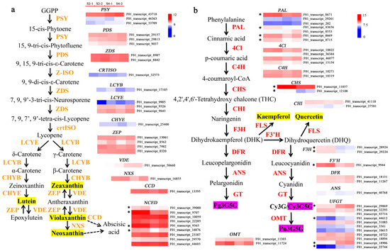 Expression patterns of the unigenes associated with (a) carotenoid and (b) flavonoid/anthocyanin metabolism pathways. The main components contributing to carotenoid (yellow shading) and flavonoid (purple shading) pigmentation in P. lactiflora ‘Coral Sunset’ petals are highlighted. The expression level was based on the FPKM value. Blue to red shading represents the gene expression level from weak to strong, respectively. S2-1, S2-2 and S4-1, S4-2 represent two sets of duplicate comparative samples, respectively. Black asterisks indicate the transcripts that differed significantly in expression level between two stages.