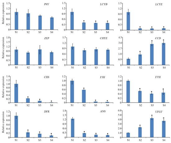 Quantitative real-time PCR analysis of the expression of the candidate unigenes associated with pigment synthesis in the petals of P. lactiflora ‘Coral Sunset’. The qRT-PCR data are presented as the mean ± SD of three independent experiments. Statistical comparison was performed by one-way ANOVA, followed by Tukey’s test. Black asterisks indicate a significant difference in the expression of the unigene between the stage and S1. S1 to S4 on the x-axis represent four stages of peony petal development. The y-axis shows the log2 ratio.