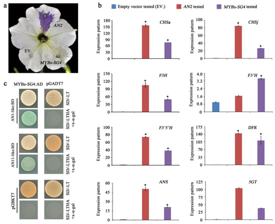 Functional identification of MYBs-SG4. (a) Petunia ‘W59×axi’ corolla coloration phenotype after transfection with MYBs-SG4. Petunia AN2 was the positive control and the empty vector (EV) was the negative control. (b) Expression levels of anthocyanin synthesis structural genes induced by overexpression of MYBs-SG4. The qRT-PCR data are presented as the mean ± SD of three independent experiments, and at least ten individual agroinfiltrated sectors from each series of agroinfection were pooled for RNA extraction in each experiment. Statistical comparison was performed by one-way ANOVA, followed by Tukey’s test. Black asterisks indicate a significant difference in the expression level. (c) MYBs-SG4 interaction with the AN1-like and AN11-like proteins in yeast two-hybrid assays. Yeast grew on a medium containing X-α-gal and displayed blue, indicating interaction between the two proteins. The double transformants with the empty vectors pGBKT7 or pGADT7, and the corresponding detection protein, were used as a control. SD/−LTHA denotes a yeast culture synthetic dropout medium without leucine, tryptophan, histidine, and adenine.