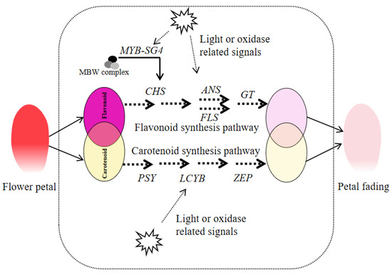 Proposed model for the regulation of pigment degradation in P. lactiflora ‘Coral Sunset’ petals. Carotenoids and flavonoids jointly determine the coloration of the petals. Light- or oxidation-related signals downregulate the expression of MYB-SG4, a member of the MBW complex, causing reduced flavonoid synthesis-related gene expression, thereby hindering flavonoid synthesis. Other regulators that respond to light or oxidative signals may also be involved in the flavonoid degradation process, and carotenoid degradation may also be subject to a similar regulatory mechanism.