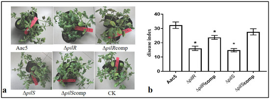 Ten days after inoculation (DAI), typical symptoms of BFB appeared in watermelon seedlings treated with different treatments (Aac5, ΔpilR, ΔpilS, ΔpilRcomp, and ΔpilScomp). The symptoms of watermelon seedlings inoculated with WT strain Aac5 or either of the two complementary strains were more severe than plants inoculated with one of the two mutant strains. No disease symptoms were present on plants inoculated with no-bacteria negative control plants (Figure 1a). The disease index of WT 10 DAI was 32.33; the disease index of ΔpilR and ΔpilS was 16.12 and 14.80, respectively; the disease index of complementary strain ΔpilRcomp and ΔpilScomp was 23.76 and 27.67, respectively (Figure 1b). The WT Aac5 had significantly greater pathogenicity compared to either the ΔpilR and ΔpilS strains (p < 0.05). The pathogenicity of two complementary strains recovered to some extent, and there was no significant difference between ΔpilScomp and WT. Although the halo diameter of ΔpilRcomp was much higher than that of the mutant strain ΔpilR, it was still significantly lower than that of WT.
