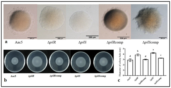 The absence of pilR and pilS leads to the loss of the twitching motility of A. citrulli. No twitching-typical halos were observed around the ΔpilR and ΔpilS strain colonies. For the wild-type, ΔpilScomp, and ΔpilRcomp strains, a twitching-typical halo was observed (Figure 2a).