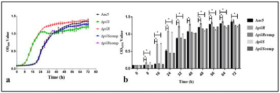 From the growth curve, it can be seen that the ΔpilR and ΔpilS reached the logarithmic and stable stages earlier than the WT and the two complementary strains, and the two complementary strains and WT showed the same curve pattern (Figure 4a). The OD600 values of ΔpilS were significantly higher than that of the WT at each measurement time from 8 to 32 h. After 40 h, the OD600 value of the ΔpilS strain was not significantly different from the WT. For each measurement time from 48 to 72 h, the OD600 value of the ΔpilS strain was significantly less than that of the WT. For each measurement time from 8 to 64 h, the OD600 value of ΔpilR was significantly greater than that of the WT and entered a stable period earlier than the WT. The OD600 values of the two complementary strains were not significantly different from the WT at any measurement time from 8 to 40 h, though they were significantly lower than the WT from 48 to 72 h (p < 0.05) (Figure 4b).