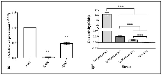 Evaluation of the relative expression of genes in Acidovorax citrulli Aac5 wild-type, and the pilR and pilS deletion mutants. (a) Relative expression of the pilA gene among the wild-type and deletion mutant strains. Relative expression levels were assessed via qRT PCR, and each deletion mutant was statistically compared to the control wild-type strain. Bars represent mean values calculated from three independent replicates. Error bars represent standard deviation. (b) Relative activity of pilA promotor β-Glucuronidase (GUS) in the wild-type strain carrying pBBR-GUS-pilAp (WT-pilAp-GUS), the pilR and pilS deletion mutants carrying pBBR-GUS-pilAp (ΔpilR-pilAp-GUS, ΔpilS-pilAp-GUS), and the wild-type strain carrying pBBRNolacGUS (WT-GUS), which was used as a negative control. The error bar represents the standard deviation. Two asterisks (**) above a bar indicate strains with significant differences p < 0.01 (Student’s t-test); *** on top of the bar indicates strains with significant differences in the GUS (ANOVA, p < 0.001).