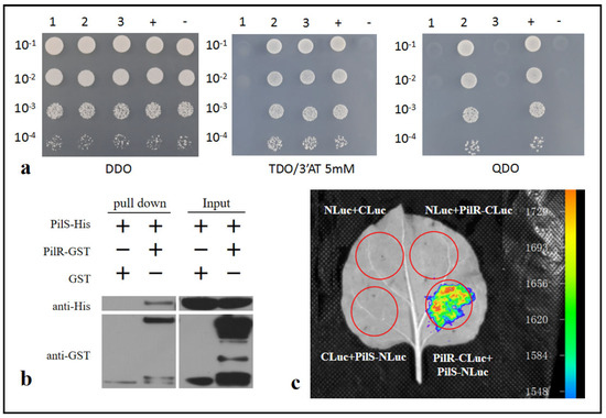 Several assays evaluating the interactions of PilR and PilS proteins. (a) Yeast two-hybrid assay. 1. co-expresstion of pilS-pBT3-N and pPR3-N (self-activation verification); 2. co-expression of pilS-pBT3-N and pOst1-NubI (functional verification); 3. co-expression of pilS-pBT3-N and pilR-pPR3-N (experimental group); +. co-expressed with pTSU2-APP and NubG-Fe65 (positive control group); −. co-expression of pTSU2-APP and PPR3-N (negative control group). On double drop-out (DDO) plates, co-expression of pilS-pBT3-N and pPR3-N can grow, indicating the self-activation phenomenon of PilS; on triple drop-out (TDO) plates containing a concentration of 5 mM of 3′AT, co-expression of pilS-pBT3-N and pPR3-N cannot grow, indicating that 5 mM of 3′AT can effectively inhibit self activation without affecting its function (co-expression of pilS-pBT3-N and pOst1-NubI can grow), and co-expression of pilS-pBT3-N and pilR-pPR3-N can grow normally, indicating a direct interaction between PilS and PilR; co-expression of pilS-pBT3-N and pilR-pPR3-N cannot grow normally on quadruple drop-out (QDO) plates. (b) Glutathione-S-transferase (GST) pull-down assay. PilR-GST was incubated with equal amounts of purified PilS-His and precipitated by glutathione agarose. The presence of PilS-His in glutathione agarose-bound protein was detected via anti-His immunoblot. The interactions of GST and PilS-His were evaluated as negative controls. The experiment was independently repeated three times. (c) Luciferase complementation imaging (LCI) assay. The GV3101 Agrobacterium carrying PilS-Nluc or PilR-Cluc were co-injected into N. benthamiana leaves. The leaves were collected after 48 h and observed under a live imaging device (NightSHADE LB985; Berthold).