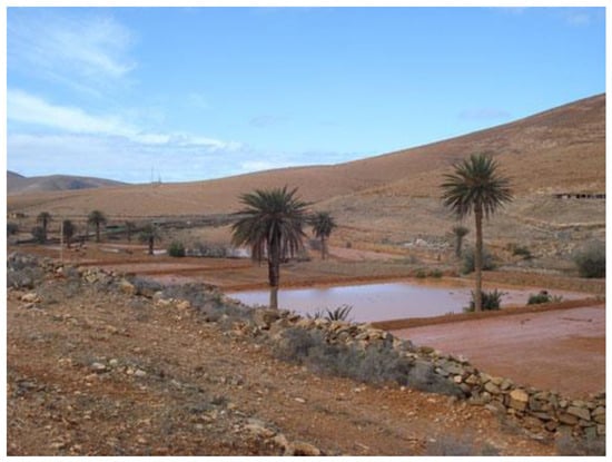 This scarcity of vine cultivation has been maintained throughout history by the presence of gavias (Figure 2). Gavias are structures built by Fuerteventura inhabitants to retain and make the most of the scarce precipitation water that falls on the island. Thus, the walls and surroundings of these structures are where most of the vines are found, planted with the aim of providing consistency to the structure’s containment dam [15].