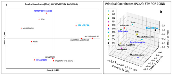 Figure 3a shows how coordinate 1 with a 21.2% goodness of fit separates the Majorera (Canary Islands), Muscat of Alexandria (Greek) and Muscat Hamburg (English) varieties from the rest, with Palomino fino and Listan prieto being very close to the axis or above it, respectively. Coordinate 2 (15.4% goodness of fit), on the other hand, places in the upper quadrants the Spanish varieties Mollar cano, Beba, Torrontes volcánico (from Lanzarote Island) and the new variety Majorera (from Fuerteventura Island), while the two Muscat varieties are above the axis. The new Majorera grapevine variety is practically located alone in the upper right quadrant. Figure 3b shows a three-dimensional representation using PCoA, with a distribution very similar to the previous one. Once again, the Majorera variety stands out from the rest of the individuals from the Fuerteventura Island collection. In this image, it can also be seen how the English grapevine variety Muscat Hamburg is significantly different from both the Majorera variety and the rest.
