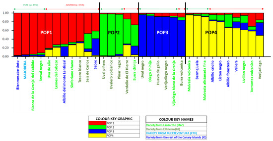 In order to obtain a better understanding of the Majorera variety behaviour and to check whether it continued to be significantly different, in this case from the varieties of the archipelago itself, a population genetics study was carried out. To this end, the 32 Canary Islands varieties were divided into six populations. This proposal was rejected because of the dysfunction of POP1 with respect to POP2 and because POP3, although well defined as such, did not have pure individuals. The proposal to divide the Canary Islands grapevine population into four ancestral populations was then taken. The membership of each individual to a given population was based on the q value, which is defined as the measure of the link of an individual with an ancestral population based on its genetic similarity (percentage of its genome inferred that belongs to the group [56]) and is ordered from the largest to the smallest value (Table S5). Seventeen admixed individuals were detected and eliminated, and the Canary Island population consisted of 15 varieties, which were divided into these four populations. POP1 held the varieties Bienmesabe tinto (Island of La Palma), Majorera (Island of Fuerteventura), Breval negro (Island of Lanzarote) and Blanca de la Granja del Cabildo (Island of Lanzarote) (Figure 4 and Figure S3). Bienmesabe tinto is a variety that was published in 2019 by TECNENOL [39] as a new variety of Vitis vinifera ssp. vinifera, and, after checking its MP-SSR in the VIVC database, did not give any match. Currently, consulting this database, it can be seen that it has been registered as the result of a cross between species of the genus Vitis, i.e., as a direct hybrid producer (DPH), having been previously described by other research groups as such [57,58]. In this sense, the fact that this MP-SSR, which shows the Bienmesabe tinto variety, is positioned so far away from the other grape varieties is of great value. Based on these data and given Majorera’s proximity to this variety and how far it is located from the rest of vinifera, it is possible that it is also a DPH. POP2 is presented as a cluster closely related to HI varieties and, in POP3, the HI and LNZ varieties share prominence. On the other hand, in POP4, we find the progeny of Malvasia Dubrovacka and Bermejuela, Malvasia volcanica and a new variety, also from LNZ, which is known as Malvasia alistanada fina. Malvasia Dubrovacka has a chlorotype A, which is very frequent in the Iberian Peninsula but rare in the Balkan Peninsula [49,53], although several studies group its MP-SSR with Malvasia profiles from the Balkans [59]. Palomino fino progeny, Listan negro (Palomino fino × Mollar cano), Albillo criollo and Albillo forastero (Palomino fino × Verdelho branco) are also located in this population. This is important because of the chlorotype D of the Palomino fino variety, which is closely related to the eastern Mediterranean basin [49,53]. Therefore, it can be concluded that this cluster groups varieties (pure or admixed) with Eastern Mediterranean influence.
