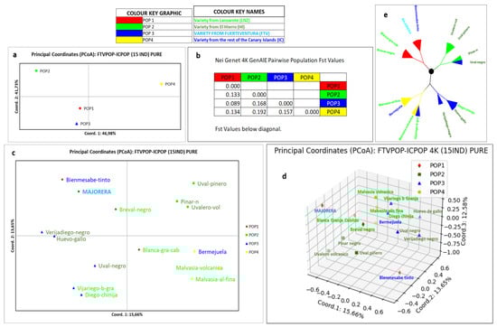 Population of Canary Islands grapevine varieties (15 pure varieties). (a) Two-dimensional representation of the 4 Canarian populations by population. (b) Values of the Fst statistic for each population. (c) Two-dimensional representation of the 4 populations by individuals. (d) Three-dimensional representation of the 4 populations by individuals. (e) Phylogenetic tree of the 4 populations by individuals. The names in navy blue correspond to Canary Islands varieties, the name in light blue corresponds to the Fuerteventura Island variety, the names in acid green correspond to Lanzarote Island varieties and the names in dark green correspond to El Hierro island varieties.