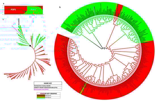 The world population (259 individuals) distributed into 2 populations. (a) Graphical representation of K = 2 according to Structure 2.3. (with pure and admixed individuals); (b) neighbour-joining circular dendrogram of the 259 world population pure individuals, highlighting the location of Bienmesabe tinto (pink and bold), Majorera (capital and bold) and IC varieties (bold). (c) Phylogenetic tree corresponding to the population of 259 pure individuals, highlighting the Bienmesabe tinto and Majorera varieties.