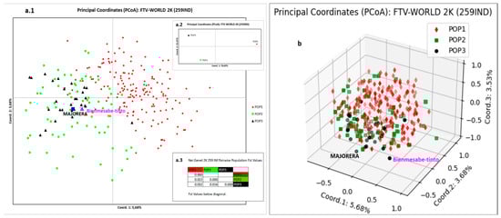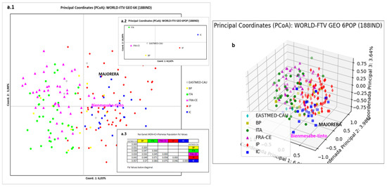 The first strategy that was tested was purely genetic. Structure 2.3 prioritised the distribution K = 2, forming two populations that are markedly differentiated: POP1 (with mostly varieties from the rest of the world) and POP2 (with mostly Spanish individuals and from which the Canarian population was extracted (POP3)) (Figure 6b,c and Figure 7a,b). This behaviour is observed in all TECNENOL works; in the same way, the CI population singularity with respect to the Spanish population and also with the world population is also observed in all of them (Figure 7(a.2,a.3)) when working with total populations. However, in the representations with all individuals in the form of a circular dendrogram (Figure 6b), phylogenetic tree (Figure 6c) and two-dimensional PCoA (Figure 7(a.1)), it is no longer possible to demonstrate the uniqueness of IC with respect to POP2. If the behaviour of the varieties Bienmesabe tinto and Majorera is observed in these graphical representations, with the former being a DPH and the latter having the potential to be one, there are no significant differences with respect to the rest of the varieties either. Bienmesabe tinto and Majorera varieties’ locations overlap with the populations of POP2 and POP3 (IC) without giving relevant information. Only in the three-dimensional representation (Figure 7b) do these two varieties appear as significantly distant from the rest, especially the Bienmesabe tinto variety. It should be noted that an additional dimension adds reliability to the final result. In this case, the reliability went from 9.36% in the two-dimensional representation to 12.88% in the three-dimensional graph, which represents an increase of 27.33%. Despite this, the final goodness of fit is still significantly low and similar to that described by most authors for PCoA in two dimensions [59,60].