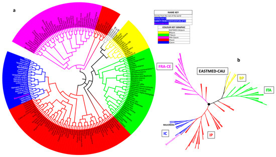 When distributing the world population into six geographical areas, the global behaviour observed was similar to the previous one. The representation by population, once again, shows the uniqueness not only of the IC varieties but also the uniqueness of the PI varieties with respect to the rest of the varieties in the world (Figure 8a,b and Figure 9a.2,a.3,b). In addition, the singularity between IC and PI can also be observed, although they are closely related. In contrast, the individual representation in Figure 9(a.1) shows no differentiation between IC and PI. Figure 8a,b show how some PI varieties are located in branches belonging to the EAST-MED-CAU, BP and ITA areas, and in the one belonging to the FRA-CE area. This transposition may well be due to the influence of the MP-SSRs in question on these reference areas. Possibly, this influence is due not only to the conquest of new territories by the Crown of Aragon, which in the Middle Ages reached as far as the Balkan Peninsula [61], but also to the Camino de Santiago (FRA-CE) [62]. It is obvious to think that, in these situations, there was a bidirectional transfer of varieties. Regarding the varieties Bienmesabe tinto and Majorera, again it will be the three-dimensional PCoA representation (Figure 9b) that distinguishes these varieties significantly from the rest of the world varieties.