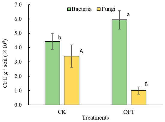 The colony formation unit of soil culturable bacteria and fungi in CK and OFT treatment. Different initial/capital letters indicate significant differences among the treatments in bacterial or fungal CFU, individually.