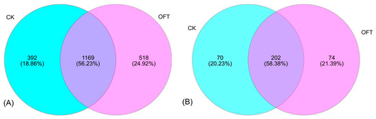 Venn diagram based on OTU of the treatment and control ((A). Bacteria; (B). Fungi). Blue color represents control, and pink color represents optimized fertilization treatment (OFT).