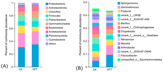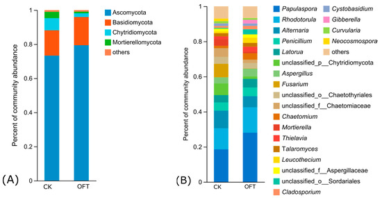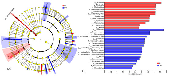 For soil fungi, according to LEfSe analysis (LDA threshold 2), it can be seen (Figure 6) that there are 18 and 12 taxa contributing significantly to the differences in CK and OFT treatments, respectively. Mortierellomycota represented biomarker in the control soil at phylum level (Figure 6A). The genera Acremonium, kernia, Mortierella, Fusarium, and Phialosimplex contributed significantly to the differences between the treatment and control (p < 0.05) (Figure 6B).