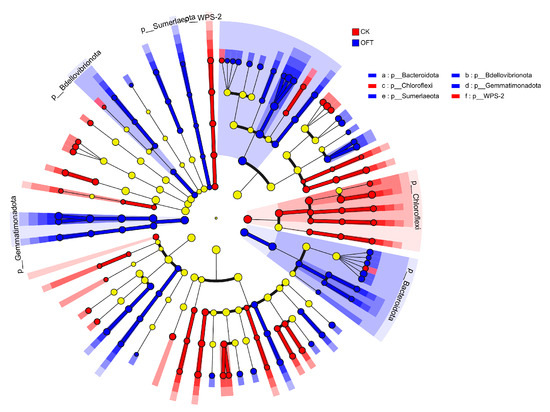 LEfSe analysis at multiple bacterial taxonomic levels indicating the difference among optimized fertilization treatment (OFT) and the control (CK). Red, blue, and green dots indicate taxa significantly enriched in CK and OFT treatments, respectively. Yellow dots represent the bacteria taxa without difference among treatments.