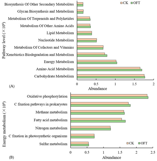 Potential functional gene abundance of bacteria participating in metabolic pathways (A) and energy metabolic pathways (B) in different treated soils, as predicted by KEEG.