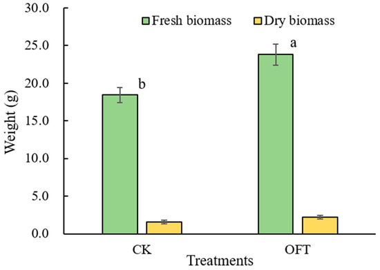 Fresh and dry weight of Chinese cabbage under different treatments. Different letters indicate significant differences among the treatments in biomass of Chinese cabbage.