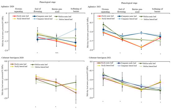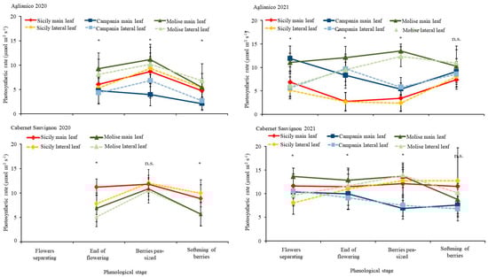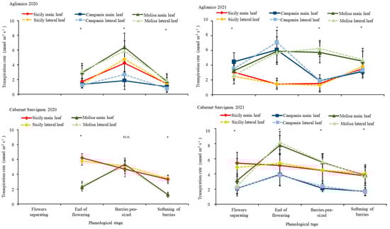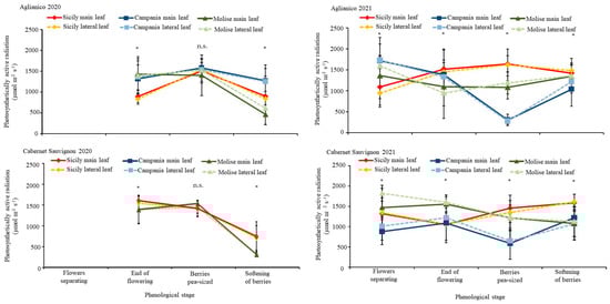 | 2020 | Aglianico | Sicilia | Main | 3.68 ± 0.97 n.s. | 2.3 ± 3.11 n.s. | 4.15 ± 2.21 ab | |