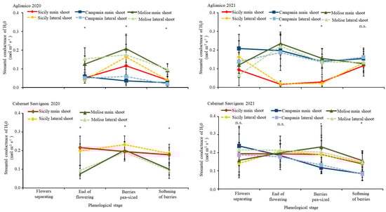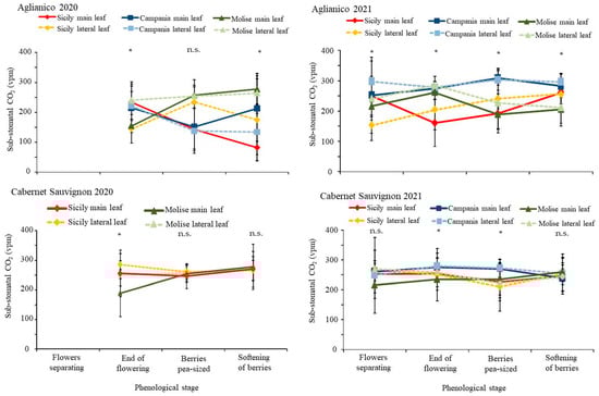 | Cabernet Sauvignon | Sicilia | Main | 2.20 ± 0.50 b | 2.32 ± 0.45 ab | 3.26 ± 2.14 n.s. | 3.99 ± 1.20 a | |