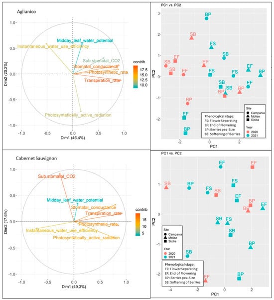 Physiological and Productive Responses of Two Vitis vinifera L. Cultivars across Three Sites in Central-South Italy