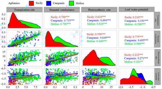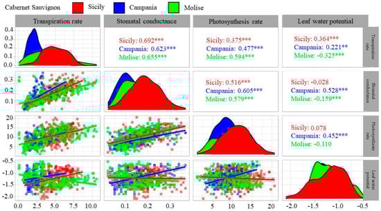 Ferlito, F.; Nicolosi, E.; Sicilia, A.; Villano, C.; Aversano, R.; Lo Piero, A.R. Physiological and Productive Responses of Two Vitis vinifera L. Cultivars across Three Sites in Central-South Italy. Horticulturae 2023, 9, 1321. https://doi.org/10.3390/horticulturae9121321