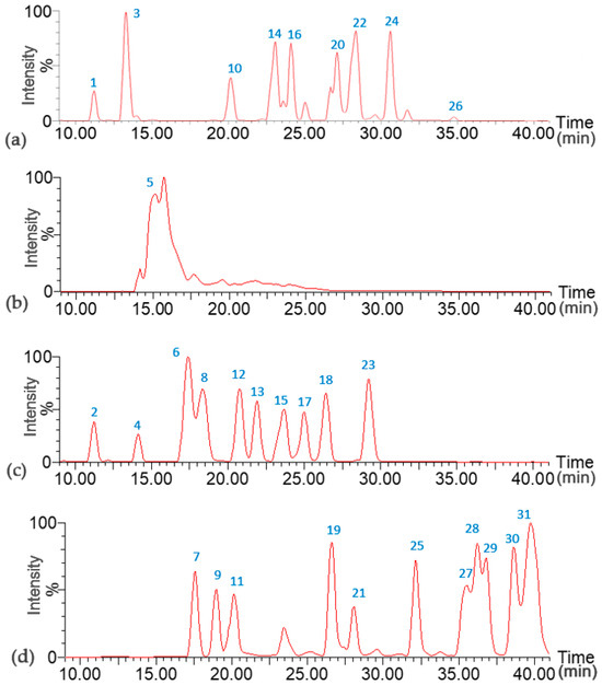UPLC-ESI-QTOF-HRMS extracted ion chromatograms of piperamides from Piper nigrum cultivated in Costa Rica. [M + H]+: (a) 274, 276, 330, 356, 358, 384, 398, 412, 426; (b) 286; (c) 272, 288, 314, 312, 340, 342, 344, 368, 370, 396; (d) 326, 328, 224, 386, 382, 332, 334, 332, 336, 346, 362. Peak numbers correspond to assignation as described in Table 1.