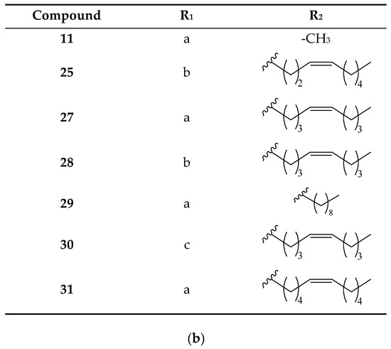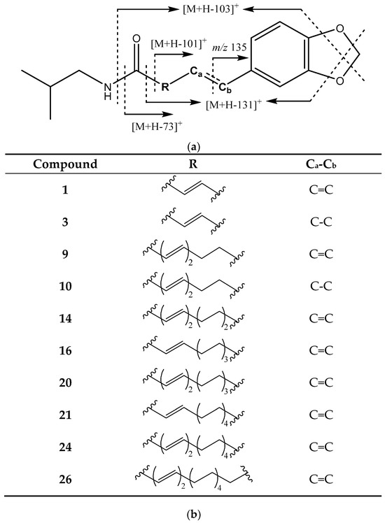 Finally, peak 30 (Figure 1d), assigned to 1-(octadeca-2E,4E,13Z-trienoyl)piperidine, had a fragment pertaining to the aliphatic unsaturated chain at [M + H − C2H4]+ and another at [M + H − 85]+ from the loss of piperidine [20,35].