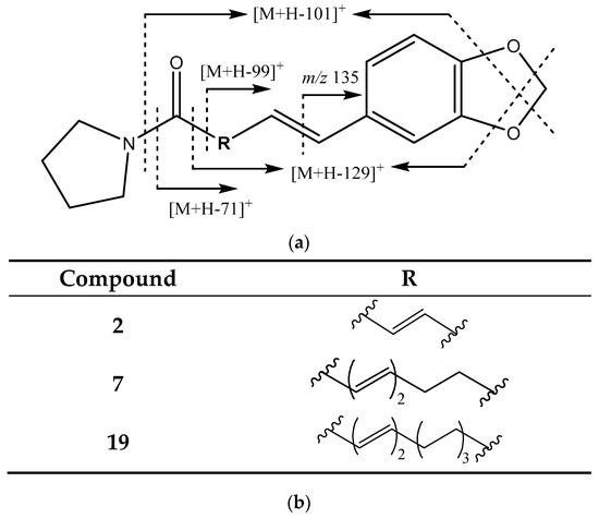 (a) Structure and main fragments for piperamides with a methylenedioxyphenyl moiety and a pyrrolidine cycle. (b) R chain for each piperamide in this group.