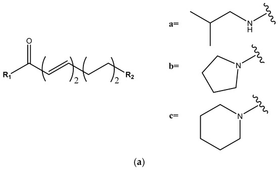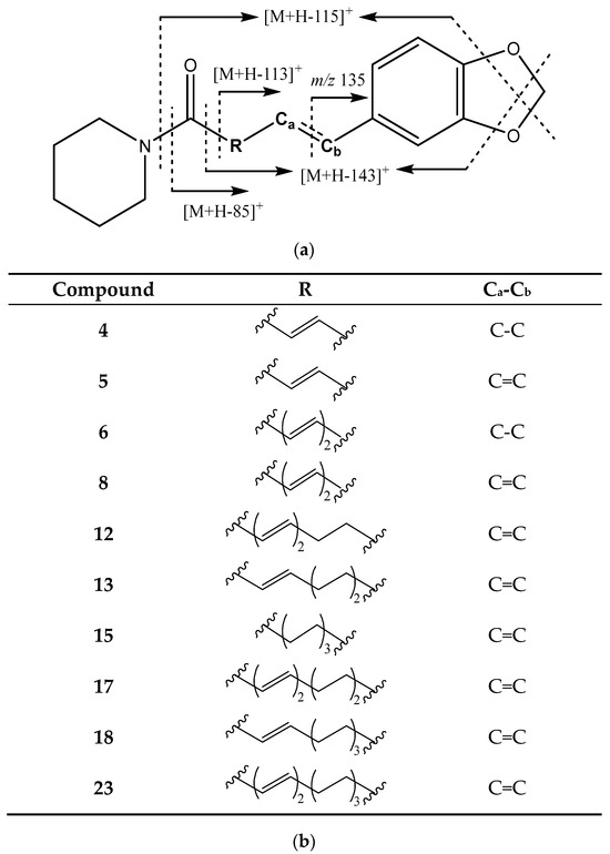 (a) Structure and main fragments for piperamides with a methylenedioxyphenyl moiety and an isobutyl amine substituent. (b) R chain and Ca-Cb bonding for each piperamide in this group.