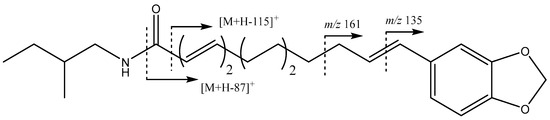 The remaining group of peaks lacks the methylenedioxyphenyl group in their structures (Figure 6). Peak 11 (Figure 1d), assigned to pellitorine, shows fragments of an aliphatic unsaturated chain at 208 Da [M + H − CH4]+, 168 Da [M + H − C4H8]+, and 154 Da [M + H − C5H10]+ [29,33]. Peaks 25 and 28 (Figure 1d) were identified as isomers 1-(octadeca-2E,4E,12/13Z-trienoyl)pyrrolidine, with fragments at 261 Da [M + H − 71]+ and 233 Da [M + H − 99]+ from the loss of pyrrolidine and pyrrolidine amide, respectively, and an additional fragment at 304 Da [M + H − C2H4]+ [28,34], not showing fragments at 135 Da or 161 Da or the additional loss of 30 Da of CH2O from the methylenedioxyphenyl group.