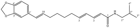 In fact, all signals shown in Table S2 and Figure S4 are coincident with the ones reported for guineensine in the literature [23]. For instance, the 13C-NMR spectrum (Figure S4b) shows peaks at δ 166.7 ppm, corresponding to the carbonyl moiety, and at δ 100.9 ppm, characteristic of the methylenedioxy group, along with the singlet at δ 5.95 ppm in the 1H-NMR spectrum (Figure S4a). In addition, the 13C-NMR shows twelve signals in the unsaturated region, consistent with the aromatic ring (δ 105.4–147.9 ppm) that, along with the respective signals in the 1H-NMR (δ 6.71–6.91 ppm), correspond to the coupling pattern for the 1,3,4 tri-substituted benzene ring.