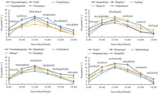 Diurnal changes in the net photosynthesis rate (Pn) of the 20 herbaceous peony cultivars. Different lowercase letters indicate differences among the 20 herbaceous peony cultivars at the same time at p < 0.05; error lines indicate standard errors.