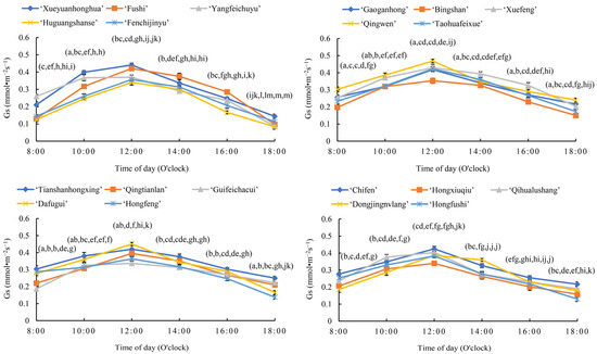 Diurnal changes in the stomatal conductance (Gs) of the 20 herbaceous peony cultivars. Different lowercase letters indicate differences among the 20 herbaceous peony cultivars at the same time at p < 0.05; error lines indicate standard errors.