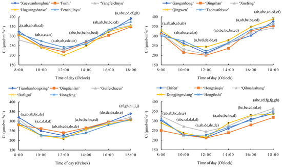 Diurnal changes in the intracellular CO2 concentration (Ci) of the 20 herbaceous peony cultivars. Different lowercase letters indicate differences among the 20 herbaceous peony cultivars at the same time at p < 0.05; error lines indicate standard errors.