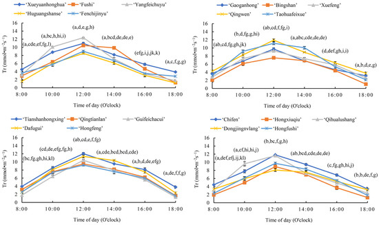 Diurnal changes in the transpiration rate (Tr) of the 20 herbaceous peony cultivars. Different lowercase letters indicate differences among the 20 herbaceous peony cultivars at the same time at p < 0.05; error lines indicate standard errors.