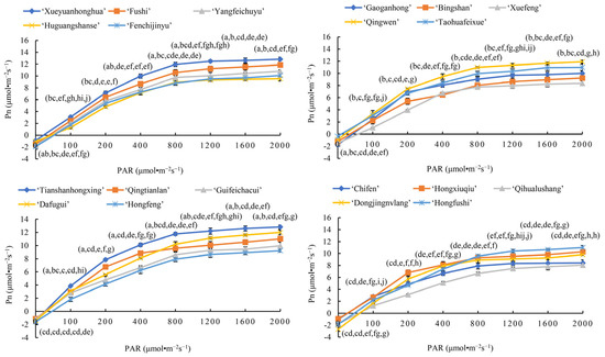 Light–response curves for the 20 herbaceous peony cultivars. Different lowercase letters indicate differences among the 20 herbaceous peony cultivars at the same light intensity at p < 0.05; error lines indicate standard errors.