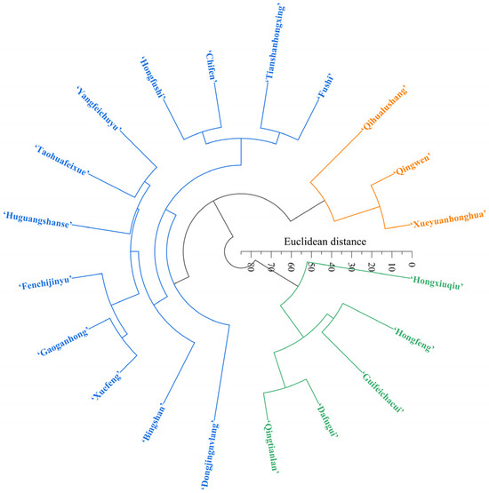 A systematic cluster dendrogram of photosynthetic metrics directly reflects the similarity of photosynthetic productivity of different cultivars; the earlier they are aggregated, the more similar their photosynthetic characteristics. The average distance clustering method was used to cluster 20 herbaceous peony cultivars with six factors score as variables. (Figure 7). Based on the similarity of their photosynthetic characteristics, the cultivars were divided into three major groups: Group I, whose Pn, Gs, and Tr values were low indicating weak photosynthetic productivity, comprised five cultivars, ‘Qingtianlan’, ‘Guifeichacui’, ‘Dafugui’, ‘Hongfeng’, and ‘Hongxiuqiu’. Group II, with medium photosynthetic productivity, comprised 12 cultivars, ‘Fushi’, ‘Tianshanhongxing’, ‘Chifen’, ‘Hongfushi’, ‘Yangfeichuyu’, ‘Taohuafeixue’, ‘Huguangshanse’, ‘Fenchijinyu’, ‘Gaoganhong’, ‘Xuefeng’, ‘Bingshan’, and ‘Dongjingnvlang’. And Group III, whose Pn, Gs, and Tr values were high indicating high photosynthetic productivity, comprised three cultivars, ‘Xuanyuanhonghua’, ‘Qingwen’, and ‘Qihualushuang’. According to the cluster analysis, the cultivars ‘Qingwen’, ‘Xuanyuanhonghua’, and ‘Qihualushuang’ had the best photosynthetic characteristics, and they also ranked high (first, second, and eighth, respectively) in terms of the comprehensive score in the principal component analysis. Thus, the results of the cluster and principal component analyses were highly consistent, suggesting that this approach can be used to effectively screen high-value germplasm resources.