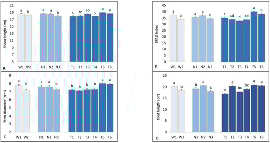 The SPAD index in plant leaves revealed that the chlorophyll content significantly increased with decreasing fertilizer application; the SPAD index was highest under N2 and N1 in W1 (T5 and T6). The highest SI was achieved with N3 treatment in W2. The stem diameter followed the same trend, with the largest diameter recorded under N2 and N1 in W1 (T5 and T6), while the largest in the W2 treatment was found under N1 (T3). Also, the root length was significantly increased with decreasing fertilizer application; the root length was longest with N1 and N2 in W1 (T5 and T6). Meanwhile, in the W2 plots, the longest roots were achieved under the N3 treatment. Similarly, the stem diameter was the largest under N2 and N1 in W1 (T5 and T6) and under N1 in W2 (T3).